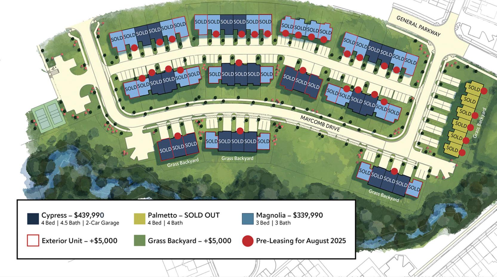 Charleston Mills features Luxury Townhomes for Aggies in College Station, Texas with floor plans starting from the mid-$300s, ranging from approximately 1700 - 2500 square feet.